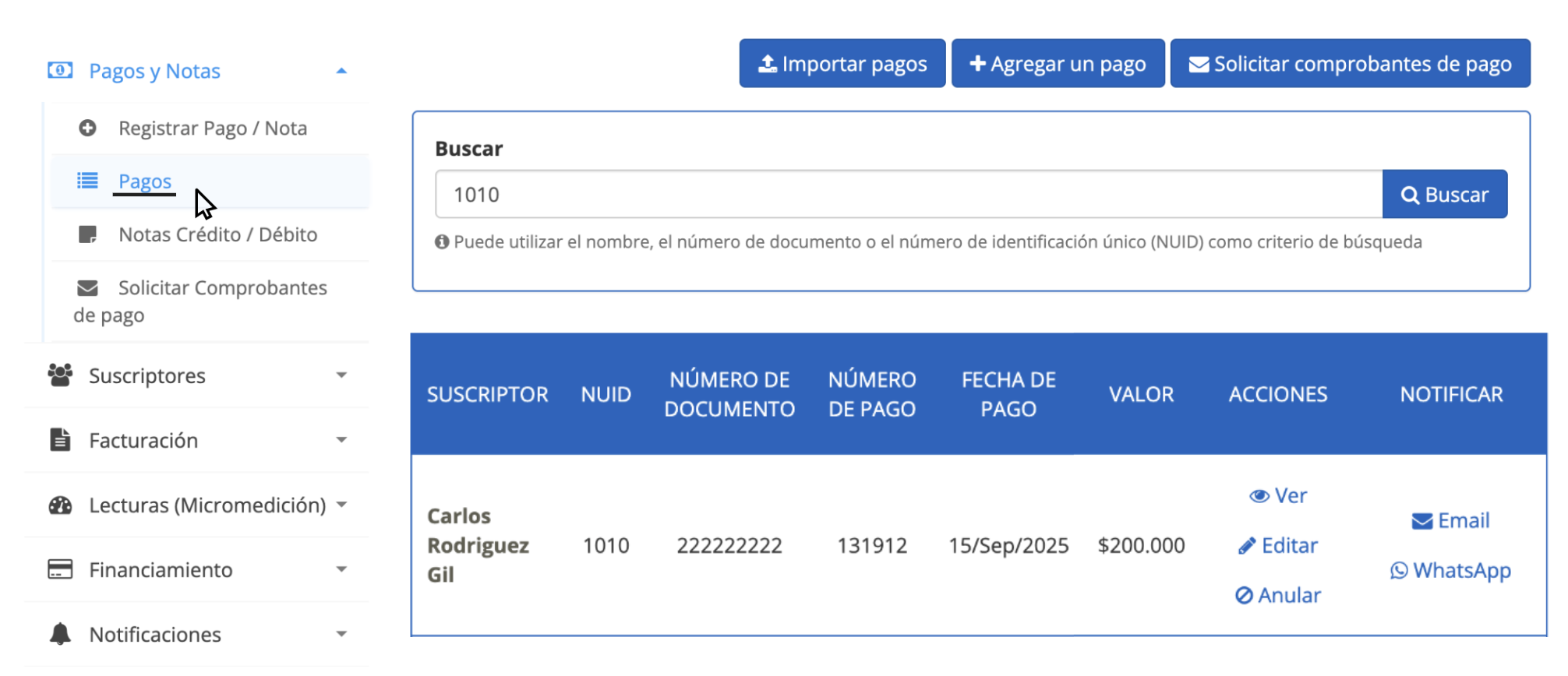 2. Busca el suscriptor al que deseas agregar el pago (puedes buscar por nombre, número de documento o NUID) y haz clic en Buscar.