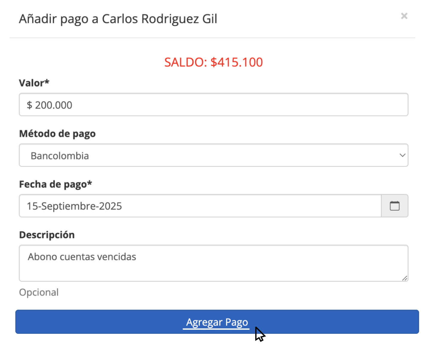 Haz clic en el botón Agregar Pago.
