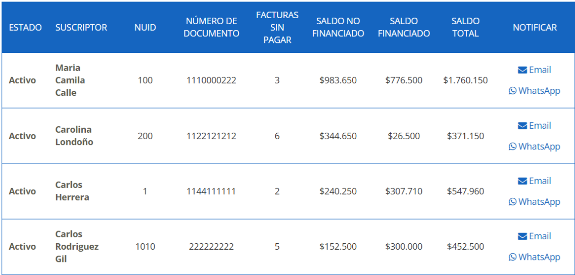 - El sistema mostrará automáticamente el listado de suscriptores con información como el estado del suscriptor, nombre del suscriptor, NUID, número de documento, número de facturas sin pagar, saldo no financiado, saldo financiado, saldo total y opciones de notificación. Esta vista te permite tener un panorama general del estado de cartera de todos los suscriptores.