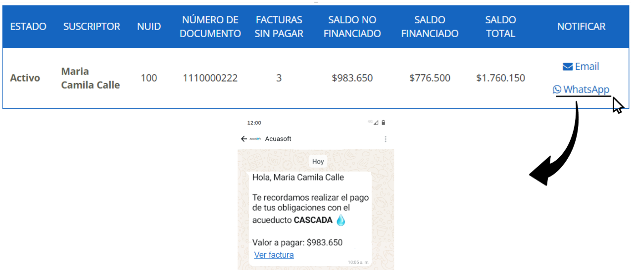 - Desde la columna Notificar puedes enviar recordatorios de pago al suscriptor por Email y WhatsApp.