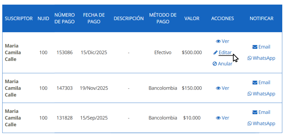 - En el listado de pagos del suscriptor, identifica el pago que deseas modificar.