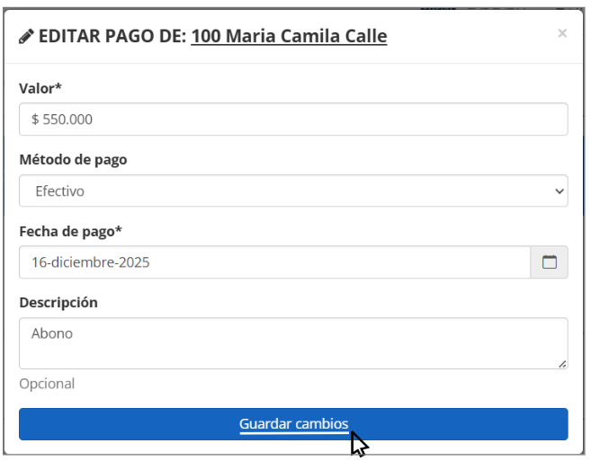 - Haz clic en el botón Guardar cambios para confirmar la modificación del pago.