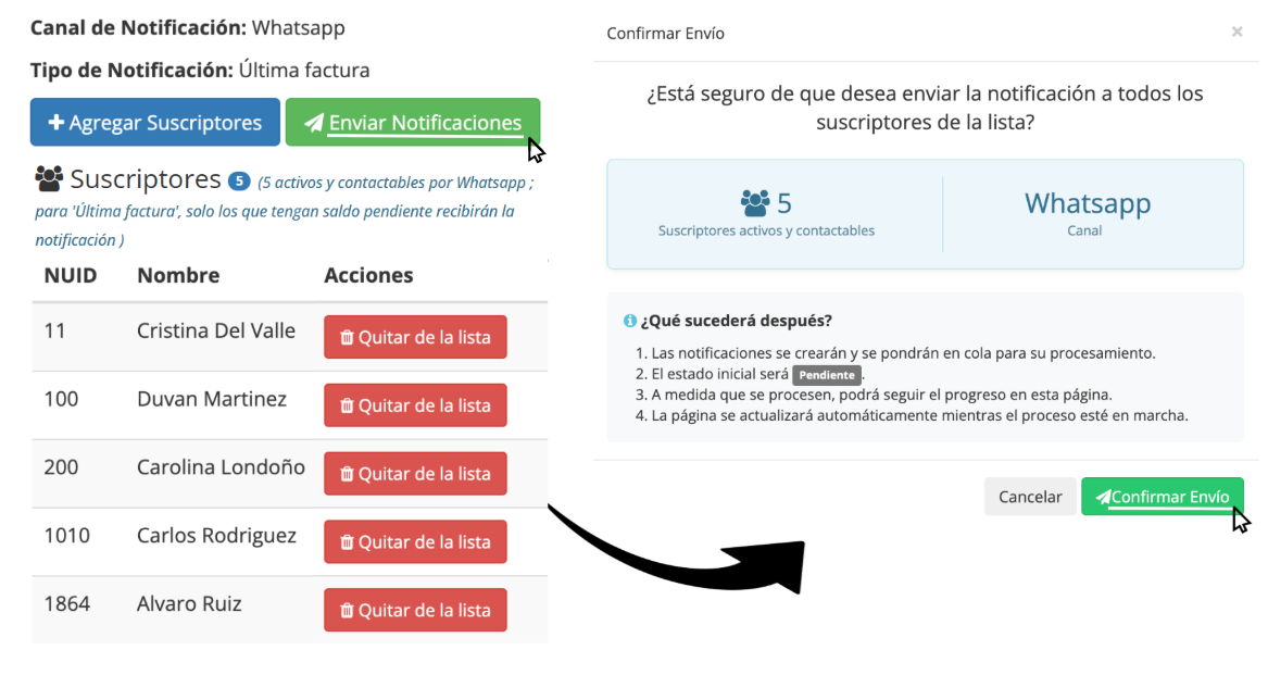 1. Para enviar la notificación, haz clic en Enviar Notificaciones. Aparecerá un mensaje de confirmación; si la información es correcta, selecciona Confirmar Envío.